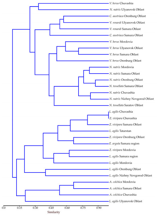 We have conducted a comparative analysis of the species structure of helminths in reptiles from different provinces of the Middle Volga region. The dendrogram of similarity of the helminth fauna of different species of snakes and lizards is presented in Figure 4.