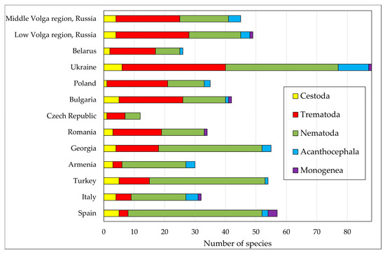 The greatest number of helminth species was recorded in reptiles from Ukraine (88) [1,14,62], Spain (57) [13,18,19,20,21,24,27,28,32,36,40,41,42,43,48,120,126,127], Georgia (55) [56,57,140], and Turkey (54) [23,25,26,29,30,31,34,44,47,49,50,104]. Somewhat fewer parasitic worms were found in reptiles in the Middle Volga region and Lower Volga region—45 and 49 species, respectively [17,33,35,37,46,52,53,59,60,67,68,69,70,71,72,73,74,75,103,106,108,128,134,135,138]. The smallest number of parasite species was found in reptiles in the Czech Republic (12 species) [1,54] (Figure 5). Trematodes, nematodes, and cestodes were found in reptiles in all the countries studied. Acanthocephalans were not recorded in reptiles from the Czech Republic and Romania. Polystomes were recorded only in Ukraine, Romania, Bulgaria, Italy, Spain, and the Lower Volga region (Russia) [1,15,40,41,43,55,62] (Figure 5).