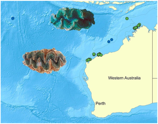 In Western Australia, the world-heritage-listed Ningaloo Reef is a regional beacon of coral reef studies, with a history of giant clam research there [37,38,39]. Early studies of giant clam population demographics were thought to represent T. maxima, based on morphological identification [37], until a later genetic study found no evidence of T. maxima at Ningaloo [39]. Species are similar in size and shell characters, with mantle differences often cited as the best means of differentiating these two species in the field. Tridacna maxima exhibits concentrated hyaline organs along the mantle periphery and the absence of teardrop features on the mantle edge, while T. noae does not exhibit concentrated hyaline organs along the mantle periphery but is often identified through the presence of often light or white-colored teardrop markings on the mantle edge [37]. The absence of T. maxima at this site then prompted Johnson et al. [39] to query the occurrence of T. maxima in Western Australia more broadly. While photographic records [40] and museum vouchers (often dead shells) form the basis of speculations that T. maxima exists in Western Australia, genetic-based validation is absent. Moreover, T. noae has not been genetically validated outside of Ningaloo Reef in the state [19,39].