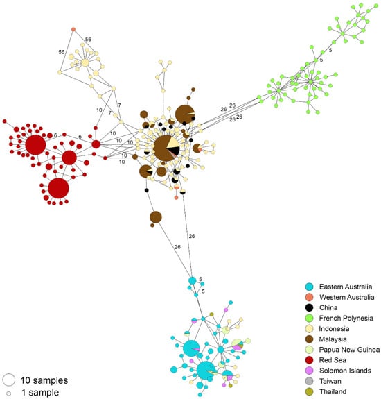Our T. maxima haplotype network revealed that between three and four discrete haplotype groups were present among our sampled individuals (Figure 2). Individuals from the Western Pacific (bottom of Figure 1) were separated from the Indian Ocean and Red Sea (central) group by ≥26 mutations. Similarly, ≥26 mutations also separated individuals from French Polynesia (upper right of Figure 1) and those from the Indian Ocean and Red Sea. Interestingly, double the mutations (>52) separated French Polynesia from the Western Pacific group. Within the central group, Red Sea individuals were separated from Indian Ocean individuals by ≥10 mutations.