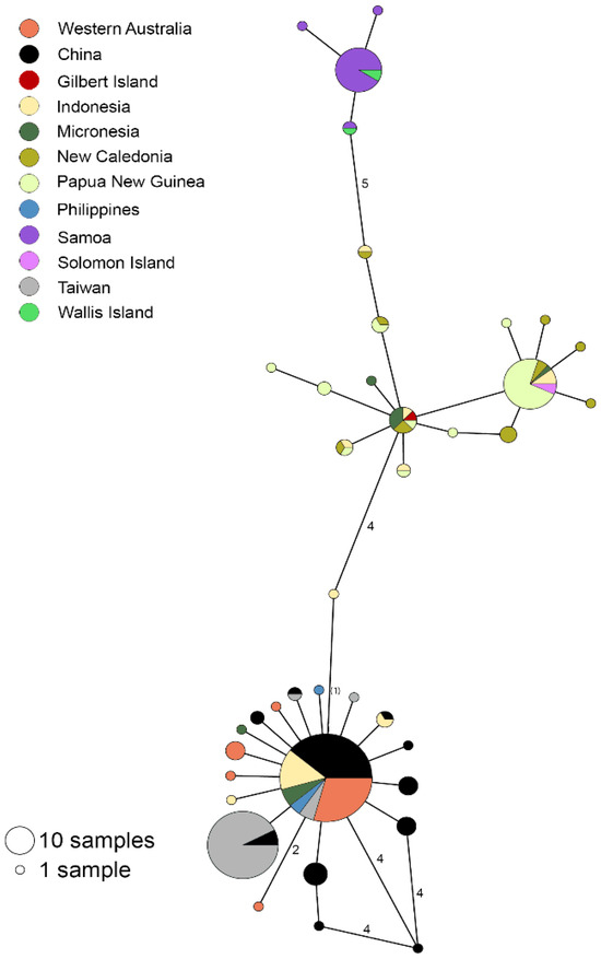 Visualization of our T. noae haplotype network revealed less population structure, relative to T. maxima—that is, only 1–13 mutations separated the five large haplotypes (Figure 3). However, fewer bases were analyzed, due to a higher proportion of missing data and non-overlapping sequences (T. maxima = 445 bp; T. noae = 378 bp). Tridacna noae from Western Australia fell in a haplogroup with the Philippines and, like T. maxima, Taiwan, China, and Indonesia, as well as Micronesia. East Australian T. noae was not available so affinities there could not be tested.