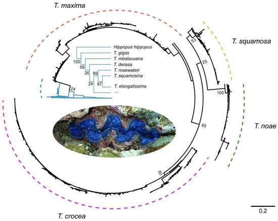 - Ma, H.; Yu, D.; Li, J.; Qin, Y.; Zhang, Y.; Xiang, Z.; Zhang, Y.; Yu, Z. Molecular phylogeny and divergence time estimates for native giant clams (Cardiidae: Tridacninae) in the Asia-Pacific: Evidence from mitochondrial genomes and nuclear 18S rRNA genes. Front. Mar. Sci. 2022, 9, 964202. [Google Scholar] [CrossRef]