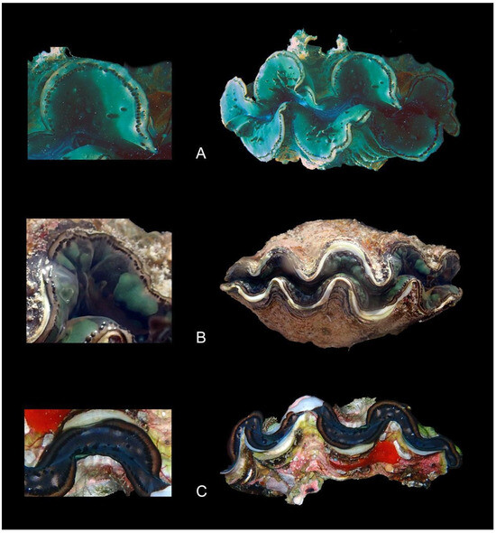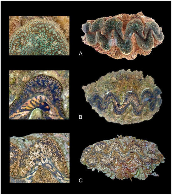 Color forms and mantle features of Tridacna maxima from Western Australia: (A) WAM S68248 and (B) WAM S 68249, both Imperieuse Reef; (C) WAM S68179, Rowley Shoals.