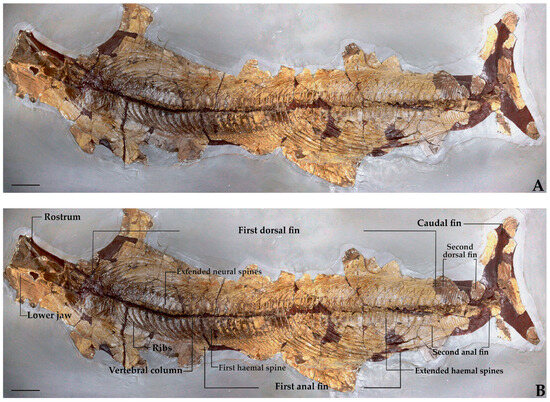 Figure 5. (A,B) †Palaeorhynchus humorensis Brustur and Grigorescu, 1973 [24], CLPUB–LPB/II640, Dysodilic Shale intercalation from the upper part of the Kliwa Sandstone Formation (Piatra Pinului, Gura Humorului). Scale bar: 10 cm.Name in collection: †Palaeorhynchus humorensis Brustur and Grigorescu, 1973 [24].Number: CLPUB–LPB/II640.Location in the collection: The Geology and Geophysics Faculty Hall, University of Bucharest.Diagnosis after [24]: Elongated, fusiform body, with a maximum height of 8.2% of the body length excluding the caudal fin. The head length is 28% of the vertebral column length. The rostrum, formed by two elongated maxillaries, is 58% of the skull length. The large orbit, with nearly equal horizontal and vertical diameters, is 22.6% of the postrostral part length. There are 61 vertebrae, 21 of which are precaudal. The dorsal fin begins anteriorly, above the middle of the orbit, extending to the middle of the caudal peduncle. The anal fin is double; the first anal fin is more developed, with its anterior rays inserting opposite the 13th precaudal vertebra. The second anal fin is located behind the first, at a distance corresponding to the length of seven vertebrae. The body is covered with small cycloid scales.Remarks: For a detailed analysis and description of the species, see [24]. The most notable distinction in †P. humorensis is the presence of a double anal fin, a feature undocumented in other †Palaeorhynchus species. This could represent either a specialised adaptation (e.g., for improved manoeuvrability) or a unique taxonomic characteristic. However, the apparent “double” fin might also result from misinterpretation or a fossil preservation artefact, as no other members of the †Palaeorhynchidae family exhibit this trait. Because it is not yet clear if the double fins are a true feature and because we have only one specimen, we cannot draw any conclusions on the function of this feature.Additionally, †P. humorensis possesses 61 vertebrae, exceeding the typical range of 45–60 observed in other Palaeorhynchus species (see Table 2). This suggests either a more elongated body or a higher degree of segmentation. Detailed morphometric data for †P. humorensis (e.g., body height at 8.2%, rostrum length at 58% of total length) lack direct equivalents in other species descriptions, complicating comparative analysis. These proportions indicate a highly streamlined body shape, possibly reflecting distinct ecological or locomotory adaptations.