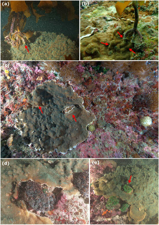 Spatial competition of foundation species. Top row: hard coral species Montipora millepora encrusting over holdfast of living brown algal species Ecklonia cava—(a) location: Bomok, date of observation: 20 June 2017; (b) location: Topyeong, date of observation: 22 October 2021; (c) M. millepora encrusting over hard coral species Alveopora japonica—location: Bomok, date of observation: 28 September 2022; (d) M. millepora partially surrounding A. japonica—location: Bomok, date of observation: 30 June 2023; (e) M. millepora completely surrounding living colony of A. japonica—location: Bomok, date of observation: 30 June 2023. Red arrows indicate areas of overgrowth and spatial competition.