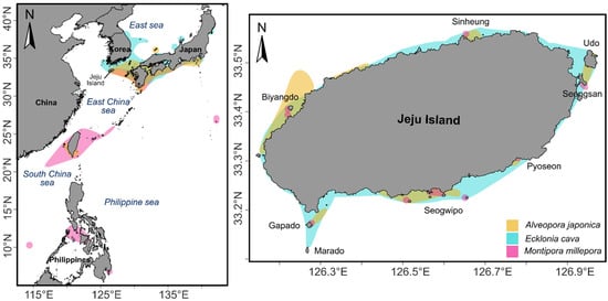 Foundation species are ecosystem-modifying organisms, often spatially dominant, that create a habitat by promoting species co-existence through the reduction in physical stress provided by their biogenic structures [1,2]. In the waters surrounding Jeju Island, the competition for space between these foundation species is evident in regime shifts that have been observed in the past: The original ecosystem was dominated by canopy-forming macroalgae, especially the native kelp species Ecklonia cava Kjellman, 1885 [3,4]. During the last three decades, a first regime shift occurred in the north of the island, from vast E. cava forests to primarily “barren ground”, i.e., areas covered by crustose coralline algae [5]. In addition, most recently, scleractinian hard coral communities have successfully been colonizing the coastal areas [6,7]. In particular, the Korean species of the Alveopora japonica species complex [8] now appears dominant in the northwest of the island, where it tends to form extensive and dense carpets, punctuated only by the occasional stalk of E. cava [9,10]. In the south, A. japonica was reported outcompeting the kelp species for space, despite reported bleaching pressure [11]. Another foundation coral gaining significance in Jeju waters is Montipora millepora Crossland, 1952, which has previously been reported to aggressively compete for space with the soft-coral species Dendronephtea gigantea Verrill, 1864 [7].