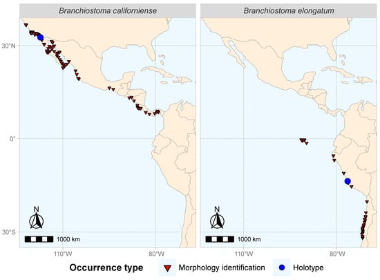 Distribution map of the American Branchiostoma species from the Pacific coast. Distribution records obtained from www.GBIF.org/occurrence/download/0007176-250310093411724 (accessed on 13 March 2025) [] and several regional articles [,,,,,]. Branchiostoma californiense type locality San Diego, California (32.646011, −117.237562). Branchiostoma elongatum type locality Chincha Island, Peru (−13.63328, −76.407). A list of all the coordinates used to create this map can be found in the figshare repository https://figshare.com/s/897b6beeaace21c57e50 (created on 14 May 2025).