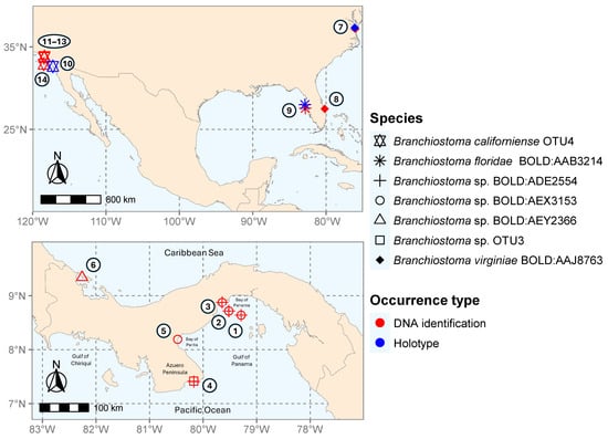 DNA verified distribution map of the American Branchiostoma species. The color of the points on the map represents the type of occurrence, while their shape indicates the different species. White circles with numbers indicate the collection sites: (1) Bay of Panama, (8.64, −79.29). (2) Southeast side of Taboguilla Island (8.80, −79.50). (3) Chumical (8.876, −79.644). (4) Achotines (7.41793, −80.17573). (5) El Salado (8.192, −80.475). (6) Bahía Almirante, Bocas del Toro, (9.34, −82.26). (7) Branchiostoma virginiae type locality Sewell’s Point, on Chesapeake Bay, Virginia (37.32732, −76.088638). (8) Fort Pierce, reef offshore, Florida (27.486, −80.185). (9) Branchiostoma floridae type locality Tampa Bay, by the Steamer Fish Hawk Sta. 7121, Florida (28.000915, −82.892243). (10) Branchiostoma californiense type locality San Diego, California (32.646011, −117.237562). (11) Redondo Beach, Los Angeles, California (33.837, −118.393). (12) Christmas tree cove, Los Angeles, California (33.76 −118.424). (13) Point Vicente, Los Angeles, California (33.741, −118.421) (14) San Clement Island, California (32.9, −118.483).
