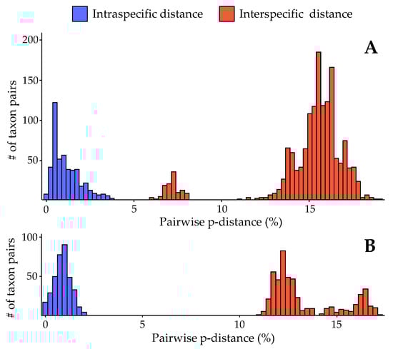 Sequences were screened for quality and used to generate contigs of forward and reverse amplicons with Sequencher version 5.4.6 (Gene Codes Corporation, Ann Arbor, MI, USA). Only sequences with more than 90% of the expected length and with a Phred quality score of at least 30 for more than 85% of the bases were combined into contigs and used for analyses. We attempted to identify these animals from comparison with published sequences from amphioxus in BOLD and GenBank using the BLASTn website https://blast.ncbi.nlm.nih.gov/Blast.cgi (accessed on 13 March 2025). We downloaded all COI sequences from BOLD and augmented this with five sequences from Panama extracted from entire mitochondrial genomes [] and three COI sequences of B. californiense from the BioGenome project []. This COI dataset was supplemented with all available COI sequences from GenBank, resulting in a final dataset of 460 sequences (Table S1). The dataset was aligned using MAFFT version 7.490 [,] in Geneious version 2025.0.3 (Dotmatics, Boston, MA, USA). Due to low coverage in the 5′ region of the COI gene, we had to remove 34 sequences from GenBank that were primarily located in the 3′ region. The final dataset included 426 COI sequences of Branchiostomatidae. We then used MEGA version 12 [] to make a neighbor-joining (NJ) cluster using p-distances model. Pairwise distances and barcoding gap analyses were made on the SPdel python pipeline using p-distances []. Potential OTUs that included sequences from Panama were identified based on visual inspection of this cluster, combined with BIN numbers generated from the COI sequences in BOLD. We aligned our new 16S sequences and 174 16S sequences available from GenBank and BOLD. We analyzed these following the same procedure as for the COI dataset. Gaps in the 16S dataset were treated using pairwise deletion in the NJ cluster construction and pairwise distance calculations in SPdel.