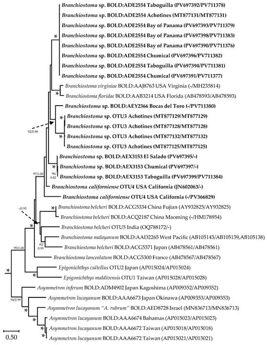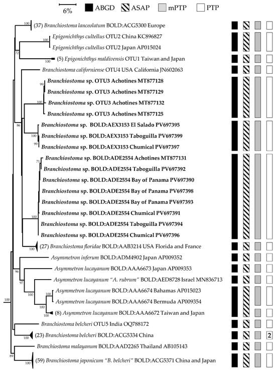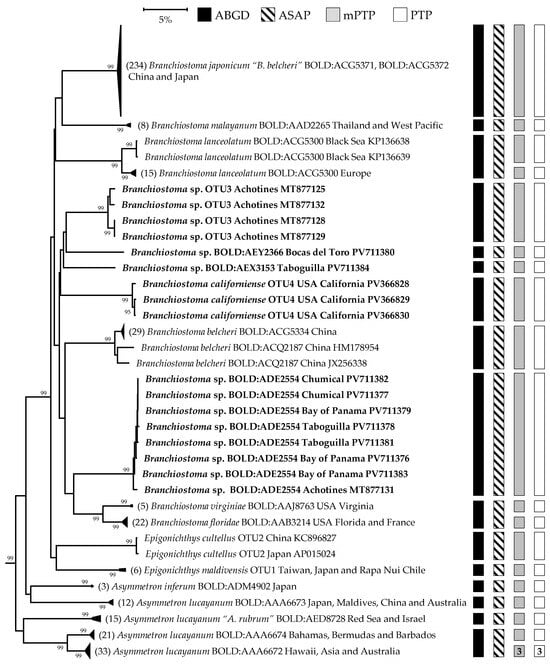 Published reports of amphioxus from the Pacific coast usually indicate that B. californiense is the only amphioxus occurring in the region and that it ranges from California, through Mexico, El Salvador, Costa Rica and south to Panama [,,,,,]. None of our three mOTUs from the Pacific coast of Panama appear to belong to this species, as they are all only ~84–88% similar to the single partial (255 bp) 16S sequence available from B. californiense (GenBank: JN602063), and 83–85% similar to the three COI sequences of B. californiense from the BioGenome project (GenBank: PV366828, PV366829, PV366830) []. All four sequences of B. californiense were collected near the type locality of B. californiense from the shore of San Diego, California (Figure 2). In Figure 2 of their paper, Del Moral-Flores et al. [], indicate the occurrence of Branchiostoma aff. californiense along the Pacific coast of Mexico, but the paper provides no further description of this putative taxon. The only other species reported from the region is Asymmetron lucayanum, which was observed in Cocos Island, Costa Rica []. This morphospecies has been shown to be comprised of at least 4 mOTUs based on mitogenomic data []. The sequences from Panama do not fall within any of these 4 mOTUs (Figure 4, Figure 5 and Figure 6), although no material from the Tropical Eastern Pacific has been sequenced so far (Figure 2). The collecting locality of the animals in OTU3 and ADE2554, near Achotines on the Azuero Peninsula, has a strong oceanic influence, and therefore may show some faunal similarities with Cocos Island. However, the photograph of the juvenile specimen MT877128 (Maikon pers. com.) does not show the extended tail typical of Asymmetron species, confirming that at least OTU3 does not belong to that genus. Finally, the only species reported from the South East Pacific are E. maldivensis from Rapa Nui [] and B. elongatum from along the mainland coast of Chile and Peru [] (Figure 1). There are no available sequences for B. elongatum to allow a comparison with our material and none of the Panamanian sequences were similar to those from E. maldivensis (Figure 4 and Figure 5).