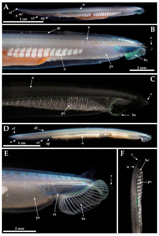 Branchiostoma adults and larvae from the Pacific coast of Panama. (A) Whole adult body and (B) magnified view of the anterior part from sample ABBAL1292-21, BIN BOLD:ADE2554. (C) Magnified view of the anterior part of post-metamorphic amphioxus ABBAK059-17, BIN BOLD:ADE2554. (D) Whole adult body and (E) magnified view of the anterior part from sample ABBAL968-21, BIN BOLD:AEX3153. (F) Magnified view of the anterior part of a pre-metamorphic larva from sample ABBAK058-17, BIN BOLD:AEX3153. Abbreviations: (a) anus, (ap) atriopore, (bc) buccal cirri, (cf) caudal fin, (df) dorsal fin, (n) notochord, (o) ovaries, (ps) pharyngeal gill slits, (r) rostrum, (vf) ventral fin, (vt) velar tentacle.