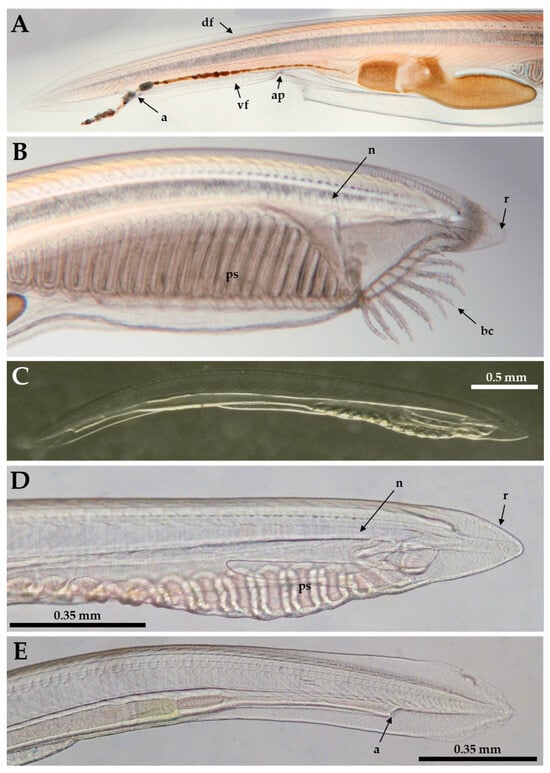 Branchiostoma juvenile and larvae from the Pacific and Caribbean coasts of Panama belonging to BIN AEY2366. Juvenile (A) anterior and (B) posterior magnified view from sample MDD02-FG02-Achotines-D1 (GenBank accession MT877128), photos taken by Maikon Di Domenico. (C) Whole body, (D) anterior and (E) posterior part of a pre-metamorphic larvae from sample ABBAI111-15, BOLD:AEY2366. Abbreviations: (a) anus, (ap) atriopore, (bc) buccal cirri, (df) dorsal fin, (n) notochord, (r) rostrum, (vf) ventral fin.