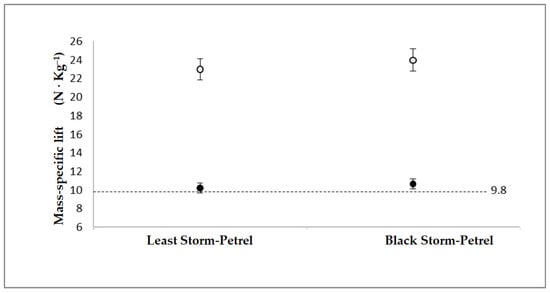 Mass-specific lift with aerobic (black circles) and anaerobic (open circles) metabolism, as expected in the model by Marden [10], in 49 LSP and 23 BSP individuals, respectively. Error bars indicate standard deviation (SD). The dashed line indicates the minimum value necessary for a bird to take off (9.8 N·Kg−1).