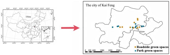 Study area map. Left panel shows the geographic location of Kaifeng City in China, marked by a red star. Right panel displays the distribution of sampling sites, where yellow dots indicate roadside green spaces and blue dots indicate park green spaces.