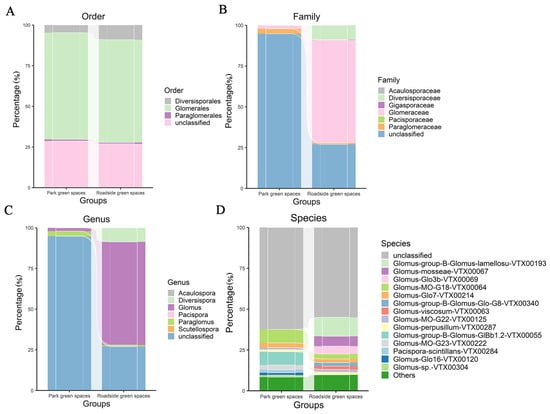 Differences in the composition of AMF communities between park green spaces and roadside green spaces at the order, family, genus, and species levels. (A) Relative abundance of AMF at the order level in different green space types. (B) Relative abundance of AMF at the family level in different green space types. (C) Relative abundance of AMF at the genus level in different green space types. (D) Relative abundance of AMF at the species level in different green space types.