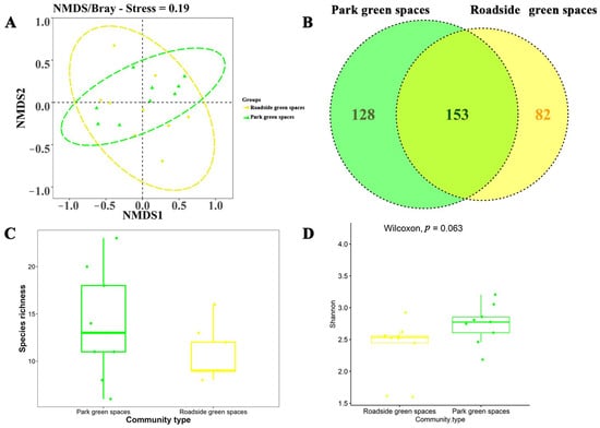 A NMDS analysis revealed significant differences in AMF community structure between park green spaces and roadside green spaces, with a stress value of 0.19, indicating a reliable ordination (Figure 3A). The Venn diagram illustrated that park green spaces contained 128 unique AMF species, whereas roadside green spaces contained 82 unique species. A total of 153 species were shared between the two green space types (Figure 3B). The species richness boxplot indicated that AMF communities in park green spaces exhibited significantly higher species richness than those in roadside green spaces (Figure 3C). Similarly, the Shannon index was consistently higher in park green spaces compared to roadside green spaces, suggesting greater AMF diversity in park environments (Figure 3D).