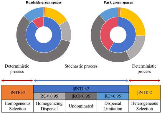 A permutation test with 999 iterations was performed to evaluate the association between sample distribution and environmental factors []. To quantify the contribution of various ecological processes to AMF community assembly in different green space types, β-nearest taxon index (βNTI) analysis was applied [,]. The βNTI metric describes phylogenetic turnover in community composition over space and time, where |βNTI| > 2 indicates that community turnover is primarily driven by deterministic processes (environmental filtering), with βNTI > 2 suggesting heterogeneous selection (variations in environmental conditions drive community divergence) and βNTI < −2 indicating homogeneous selection (similar environmental conditions lead to community convergence), whereas |βNTI| < 2 suggests that stochastic processes (e.g., dispersal-driven processes) dominate community assembly []. Furthermore, RCBray < 0.95 represents a homogeneous dispersal process, RCBray > 0.95 indicates dispersal limitation, and |βNTI| < 0.95 suggests no dominant process [,].