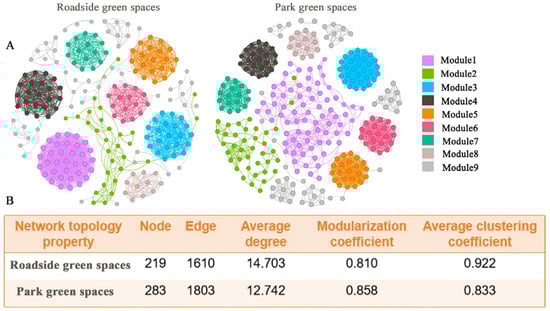 Clear structural differences were observed in the co-occurrence networks between park and roadside green spaces (Figure 5B). The network in park green spaces contained a greater number of nodes (283) compared to that in roadside green spaces (219). Similarly, the number of edges was higher in park green spaces (1803) than in roadside green spaces (1610), indicating a denser network. However, the average degree, which represents the average number of connections per node, was greater in roadside green spaces (14.703) than in park green spaces (12.742), suggesting tighter local connectivity in roadside environments. Additionally, the modularity index, which measures the extent to which the network can be divided into separate modules, was higher in park green spaces (0.858) than in roadside green spaces (0.810), reflecting a more compartmentalized network structure. In contrast, the average clustering coefficient, indicating the tendency of nodes to form tightly connected clusters, was greater in roadside green spaces (0.922) than in park green spaces (0.833).