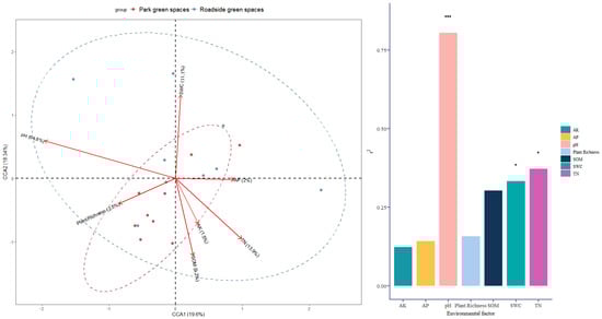 Correlation analysis between arbuscular mycorrhizal fungal (AMF) communities and environmental factors in urban green spaces. The left panel shows canonical correspondence analysis (CCA) results illustrating the relationships between AMF community composition and key soil environmental factors across two types of urban green spaces: roadside green spaces and park green spaces. Each point represents a sample, and red arrows indicate environmental variables (AK: available potassium; AP: available phosphorus; pH: soil acidity/alkalinity; SOM: soil organic matter; SWC: soil water content; TN: total nitrogen). The length of each arrow reflects the relative influence of the corresponding factor on AMF community structure. The right panel displays the explanatory power (R²) of each environmental variable on AMF community variation. Asterisks indicate levels of statistical significance (* p < 0.05, *** p < 0.001).