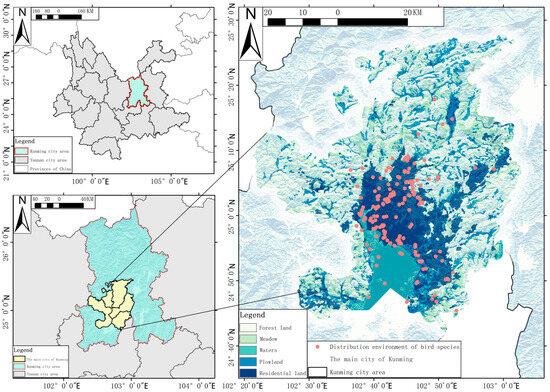Kunming is located on the Yunnan Guizhou Plateau in southwestern China (102°10′ to 103°40′ east longitude, 24°23′ to 26°22′ north latitude). The total area of the city is approximately 21,015 km2, with the main urban area covering approximately 3205 km2. The topography of the region is characterized by an increase in altitude from north to south, with an average elevation of approximately 2 km, thus classifying it as a plateau city. The city experiences a subtropical low-latitude plateau mountain monsoon climate, characterized by abundant sunshine and heat throughout the year, as well as a distinct four-season cycle. This region serves as a wintering ground for numerous avian species and functions as a transit point during the migratory period, making it a valuable resource for birdwatchers. The primary urban districts of Kunming City within the designated area, namely Panlong, Wuhua, Chenggong, Guandu, and Xishan, are characterized by diverse bird habitats that encompass croplands, woodlands, water bodies, grasslands, and residential areas (Figure 1).
