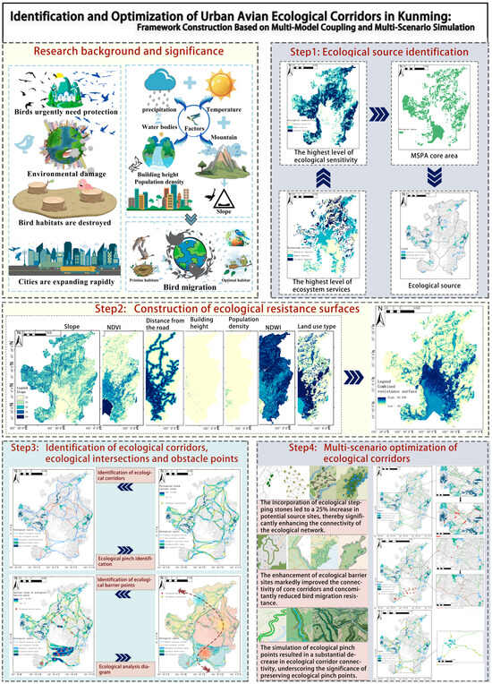 Urbanization, one of the most significant socioeconomic phenomena globally, has had a profound impact on natural ecosystems. Urban green spaces serve not only as critical recreational areas for residents but also as vital habitats for a diverse array of wildlife species. Birds, functioning as keystone species in urban ecosystems, exhibit remarkable sensitivity to environmental changes, where the integrity and connectivity of their habitats play a pivotal role in maintaining urban ecological equilibrium [1,2]. With the accelerating pace of urbanization, the fragmentation of urban green spaces has become increasingly severe, substantially compromising habitat connectivity for avian species. This degradation not only threatens avian survival and reproduction but also undermines the ecosystem services provided by urban environments [3,4,5]. Consequently, the identification and optimization of avian ecological corridors within urban green spaces hold substantial scientific significance and practical value for conserving avian biodiversity and enhancing the stability and resilience of urban ecosystems [6].