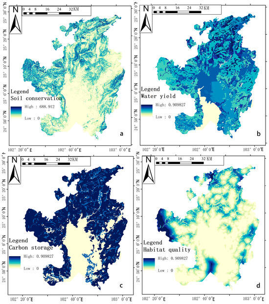 Indicator map for ecosystem services assessment. ((a): soil conservation (b): water yield (c): carbon storage (d): habitat quality).