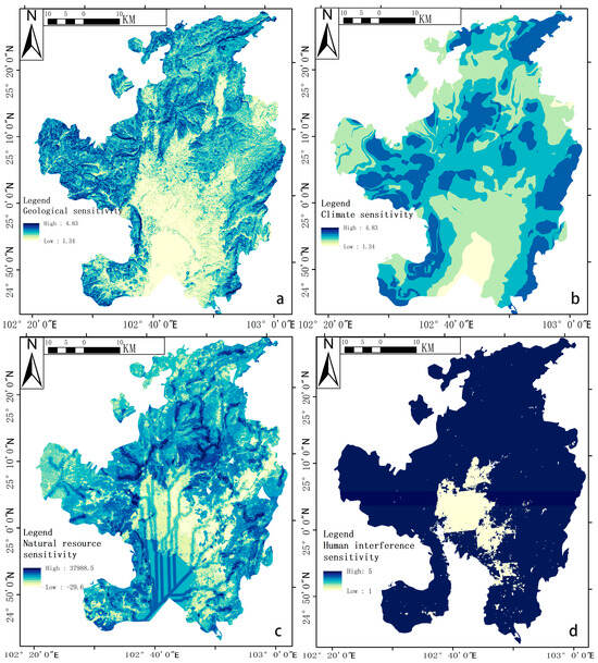 Map of indicators for ecological sensitivity assessment. ((a): geological sensitivity (b): climate sensitivity (c): sensitivity to natural resources (d): human interference sensitivity).