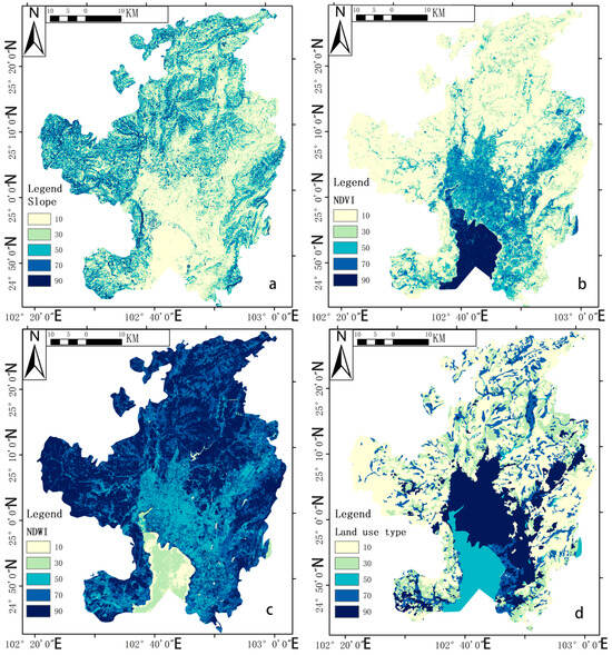 Resistance surface factor indicator chart 1. ((a): slope; (b): NDVI; (c): NDWI; (d): land use type).