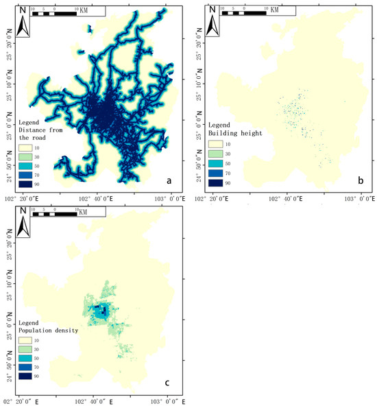 Resistance surface factor indicator chart 2. ((a): distance from the road; (b): building height; (c): population density).