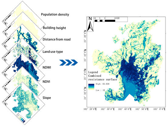 The identification of resistance surface factors constitutes a pivotal step in the process of constructing ecological corridors. These factors exert a direct influence on the dispersal of species and the connectivity of ecological processes. A comprehensive analysis of the natural environment and human activities can facilitate the identification of primary resistance factors impacting ecological processes, including terrain slope, vegetation cover, water quality, and human activities [42,45]. It is evident that the topographic slope exerts a significant influence on the selection of habitat and the mobility of species [3]. Vegetation cover plays a pivotal role in providing sustenance and a conducive environment for species to thrive. However, it is essential to recognize the potential consequences of human activities, which can lead to the fragmentation and obstruction of ecological corridors [46]. Furthermore, factors such as distance from roads, building height, and land use type were used to quantify the resistance surface [13,47], with the selection of these factors based on the ecological needs of the species and landscape characteristics to ensure the model’s accuracy and applicability. Consequently, in this study, we selected the natural factors of slope, vegetation normalization, and water body normalization, as well as the anthropogenic factors of land use type, distance from the road, building height, and population density, and seven resistance factors to construct the resistance surface (Figure 5 and Figure 6).