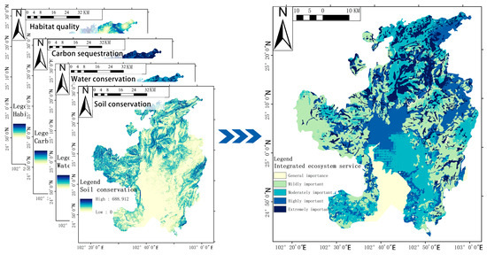 In this study, the InVEST model was employed to comprehensively assess four key ecosystem services in the main urban area of Kunming City. These services were as follows: (1) soil retention (SDR module), (2) water conservation (Water Yield module), (3) carbon sequestration (Carbon module), and (4) habitat quality (Habitat Quality module) [29]. Combined with GIS technology, the spatial patterns of ecosystem services and their dynamic change characteristics were systematically revealed, encompassing the dimensions of provisioning, regulating, and supporting service functions. The spatial heterogeneity of regional ecological functions was also elucidated [30] (Figure 3).