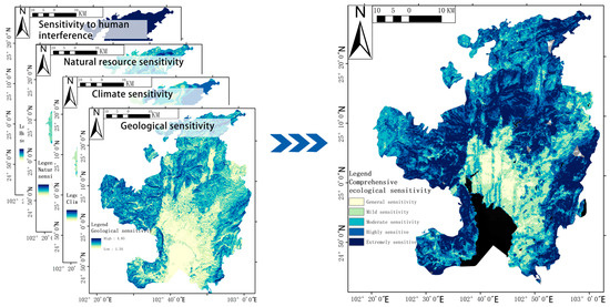 Ecological sensitivity is defined as the vulnerability of ecosystems in a given area to external disturbances and their potential ecological conservation value, reflecting the responsiveness of ecosystems to external disturbances and their potential exposure to risk [34,35,36]. The assessment focuses on quantifying the likelihood and severity of ecological problems, thereby revealing the potential negative impacts of human activities on ecosystems. Typically, areas of high ecological sensitivity exhibit poor ecosystem stability and are prone to ecological and environmental problems, such as soil erosion, biodiversity loss, and land degradation [37,38].