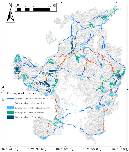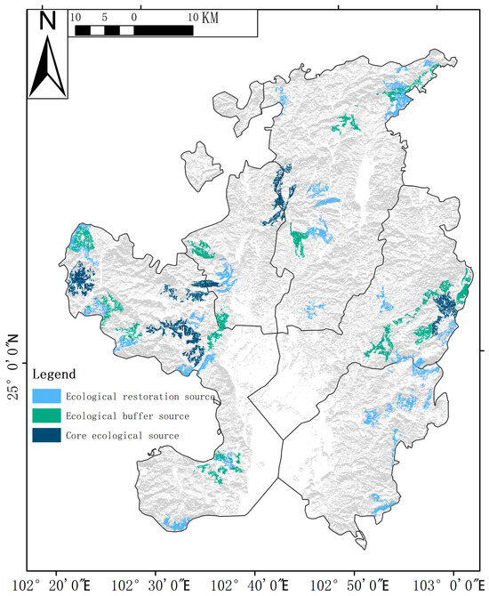 To accurately identify the most important ecological source areas, this study employed a multi-criteria overlapping analysis method. Firstly, the most significant levels of zoning were identified based on an evaluation of ecosystem service importance and ecological sensitivity. Secondly, a spatial overlay analysis was performed with the core area obtained from MSPA, and the most optimal ecological source distribution was obtained through intersection processing (Figure 10). The results of the landscape connectivity analysis, conducted using Conefor software, revealed that a total of 52 ecological source sites (covering an area of 200.95 km2) were identified in the study area, forming a remarkable three-level structural system. Of these, 5 Level 1 ecological core source sites (50.96 km2, 1.59%) were concentrated in ecologically critical nodes, 14 Level 2 ecological buffer source sites (62.82 km2, 1.96%) were mainly located in ecological transition zones, and 33 Level 3 ecological restoration source sites (87.18 km2, 2.72%) were widely distributed in ecologically marginal areas. The gradient distribution pattern of the ecosystem in the study area not only revealed its spatial heterogeneity but also provided quantitative support for optimizing the regional ecological security pattern by constructing a three-level ecological protection network, characterized by a “core–transition–edge” structure.