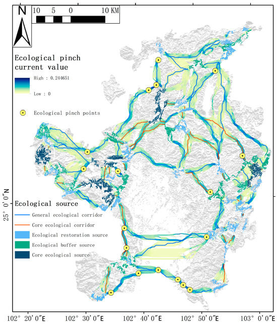 The pinch points with high current density in the ecological corridors represent pivotal nodes for maintaining landscape connectivity. These areas are also characterized as fragile regions within the ecological network, exhibiting heightened susceptibility to ecological degradation. Consequently, their protection assumes paramount importance in ensuring the functional integrity of the corridors. This study developed an ecological network degradation model under the condition of no pinch-point protection using the scenario simulation method. It quantitatively assessed the ecological benefits of pinch-point protection in enhancing the quality of corridors and strengthening weak links. Based on the ArcGIS platform, the Linkage Mapper module was utilized to analyze the raster layer of pinch points spatially, and the natural breakpoint method was employed to identify the top 20% of pinch points with the highest current density values as priority protection areas [56].