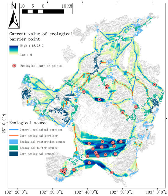 The Linkage Mapper toolbox was utilized as a multi-scale analysis method, enabling the systematic identification of ecological barrier points and ecological pinch points. Initially, the Barrier Mapper module was utilized to identify ecological obstacle points, with a radius ranging from 100 to 500 m set, and 50 m designated as the step size for multi-scale analysis. The ‘Maximum’ mode was employed for iterative operation to comprehensively capture the multilevel impacts of landscape heterogeneity on ecological processes. The output raster data were then reclassified using the natural breakpoint classification method, and high-value areas were extracted using the Feature to Point tool in ArcGIS. The output raster data were then subjected to reclassification by the natural breakpoint classification method, and the high-value areas were subsequently extracted using the Feature to Point tool in ArcGIS to identify the key ecological obstacles.