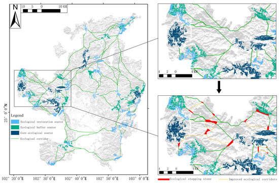 The construction of a network of ecological stepping stones involves the strategic placement of point ecological patches at the junctions of primary ecological source patches, thereby reducing the spatial distance between ecological sources and optimizing the structure of ecological corridors. This approach is intended to enhance ecosystem connectivity and mitigate habitat fragmentation [54]. The siting of ecological stepping stones focuses on areas around primary ecological source sites and the 20% of areas with the lowest ecological resistance values. The selection process employs a combination of spatial analysis and field verification to prioritize non-rural and urban residential land types, intending to preserve the structural integrity of the ecosystem and maintain the ecological function of the corridor.