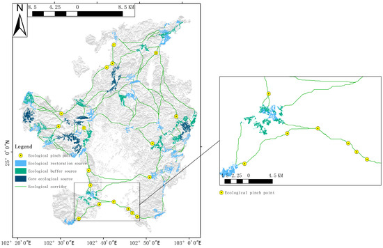 Following a comprehensive analysis, it was determined that an optimal ecological corridor width threshold of 8 km would effectively meet the ecological activity needs of bird species. This conclusion was drawn from an analysis of the calculation results of the 1–8 km weighted distance thresholds of the Linkage Pinch Mapper tool. A total of 18 key ecological pinch points (exceeding 0.1 km2) were identified through area screening, covering a combined area of 5.63 km2. These were mainly distributed in the southern part of the main urban area, with the largest patch located at the junction of the northern part of Wuhua District and the western part of Panlong District. These pinch points were characterized by low-resistance land use types, such as forests, grasslands, and watersheds, which exhibited significant bird habitat suitability (Figure 12). Conversely, 262 smaller pinch points (i.e., those with a surface area of less than 0.1 km2) were excluded because they were highly fragmented and located on the urban fringe, where ecological functions remained limited.