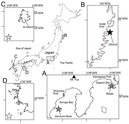 Sampling localities of Discoactis tritentaculata fam. gen. and sp. nov. in this study. A: Kanagawa and Shizuoka Prefs. A1: Senoumi Bank, Suruga Bay; A2: Misaki, Sagami Bay. B: Otsuchi, Iwate Pref. C: Iki, Nagasaki Pref. D; Sukumo, Kochi Pref.