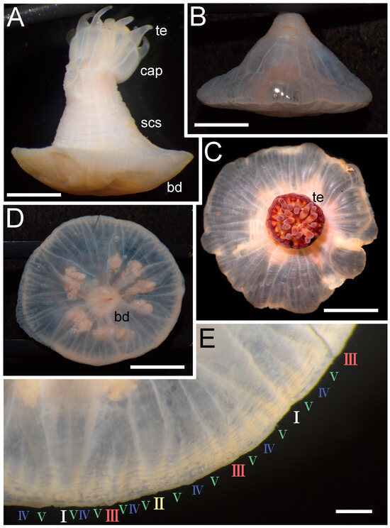 - Gusmão, L.C.; Berniker, K.; Van Deusen, V.; Rodríguez, E. Halcampulactidae (Actiniaria, Actinostoloidea), a new family of burrowing sea anemones with external brooding from Antarctica. Polar Biol. 2019, 42, 1271–1286. [Google Scholar] [CrossRef]