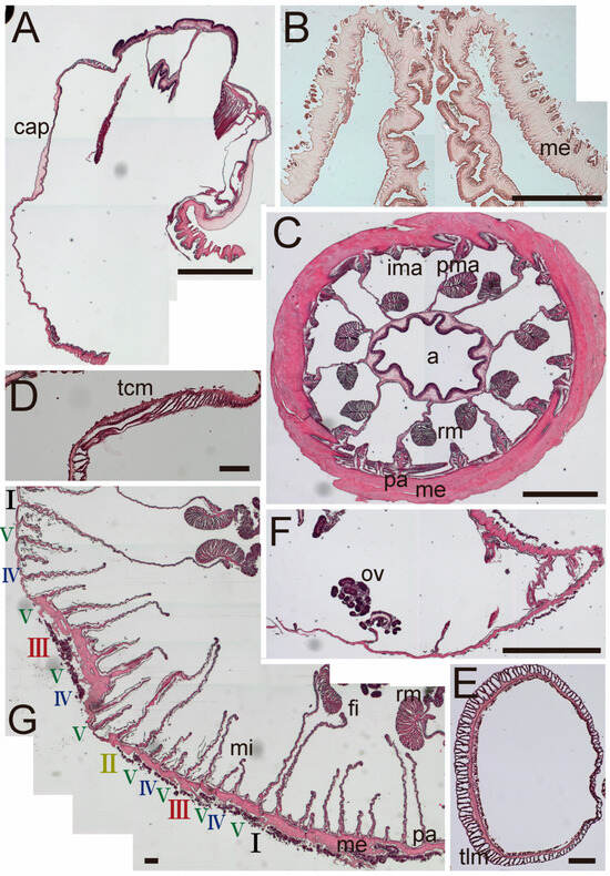 For Capnea japonica, a specimen was embedded in paraffin with three horizontally dissected parts. Then, the middle parts were dissected by a microtome to sharpen the horizontal surface, deparaffinized with xylol, substituted with butyl alcohol, dried in a t-BuOH freeze dryer, and coated with gold using an ion sputter machine. This tissue was observed using a scanning electron microscope (SEM) for the observation of the three-dimensional mesenterial arrangement.