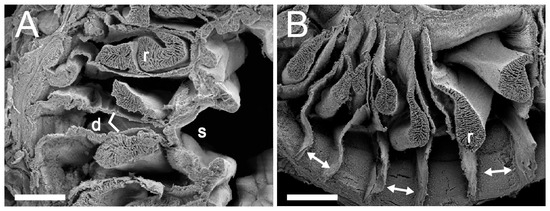 SEM image of a cross section of the mesenteries of Capnea japonica (CMNH-ZG 10798). (A) Directive mesenteries with outer side retractor muscles. (B) Three pairs of equally developed mesenteries with pinnate, circumscribed retractor muscles. Abbreviations: d, directive mesentery; r, retractor muscle; s, siphonoglyph. Left and right arrows indicate each pair of mesenteries. Scale bars indicate 500 μm.