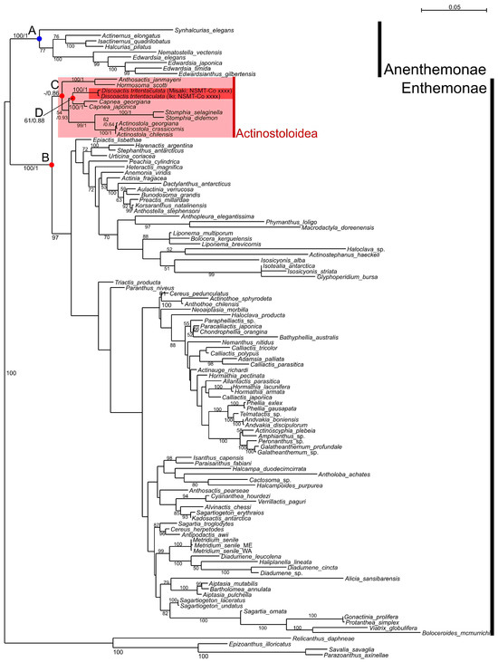 The two clades of suborders are indicated by bars. Numbers connected with slash characters above the branches indicate the ML bootstrap support values followed by the BI posterior probabilities. Numbers without slash characters indicate the ML bootstrap support values of the nodes (bootstrap values ≥50% are shown). Nodes A and B indicate the bases of the clades of suborders Anenthemonae and Enthemonae, respectively; node C is the base of the superfamily Actinostoloidea; and node D is the node of Discoactis tritentaculata and the family Capneidae.