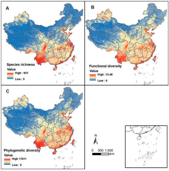 Previous studies have categorized indices of species diversity, phylogenetic diversity, and functional diversity into three aspects of diversity characteristics: richness, divergence, and regularity [18,41]. The selection and calculation of multi-dimensional diversity indices should be determined based on the actual research questions. This study focuses more on the conservation of diversity. The indices selected are commonly used in conservation biology and are capable of representing the richness of different types of diversity, thus holding significant conservation value. Building upon previous research that has primarily focused on and conserved areas with high species richness, this study extends its scope to regions with high richness in other types of diversity. This represents an extension in different dimensions within the same conservation direction. The functional diversity index used in this study is derived from functional dendrograms, allowing it to be consistent with the phylogenetic diversity index within the same research framework [34]. In addition to the indices used in this study, future research could employ other metrics to describe different aspects of diversity. For instance, functional dispersion (Fdis), mean pairwise distance (MPD), and mean nearest taxonomic distance (MNTD) can be used to quantify the divergence of diversity patterns. Functional evenness (FEve), variance in pairwise distance (VPD), and variance in nearest taxonomic distance (VNTD) can be used to describe the regularity of diversity patterns. These indices can be utilized to elucidate community assembly mechanisms from functional and phylogenetic perspectives [42,43,44]. For instance, in addition to conserving areas with high richness, regions with high divergence should also be considered for conservation. Areas with high functional diversity can provide more ecological niches for species and offer a greater range of ecosystem services, thus holding conservation significance.