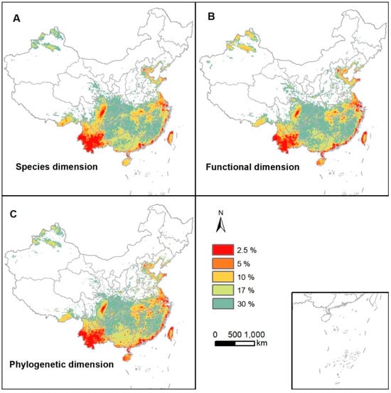 The distribution of assessed prioritization values of birds in China under each of the three diversity dimensions: (A) species diversity, (B) functional diversity, and (C) phylogenetic diversity. The top 2.5%, 5%, 10%, 17%, and 30% ranks of all grids displayed.