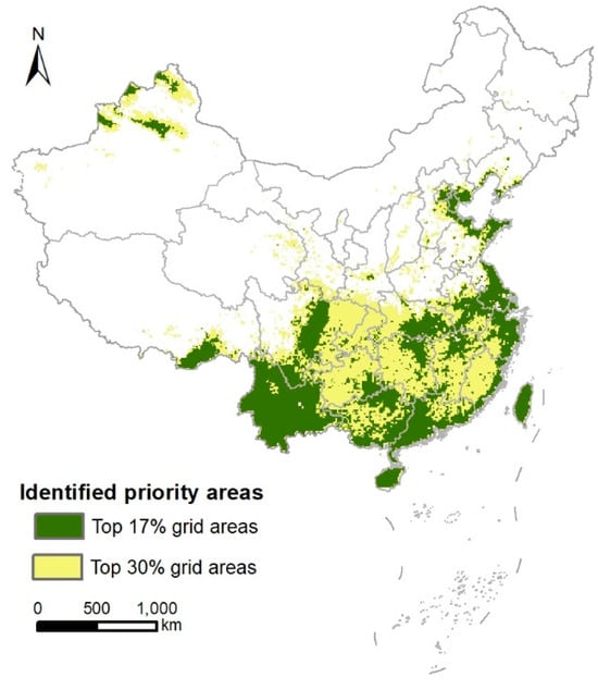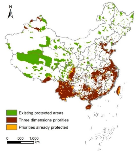 When considering the conservation target scenario of 30% protected area, there are 29,081 grid cells (approximately 2.90 × 106 km2) where the priority is assessed to be in the top 30% across all three dimensions of diversity. These areas are mainly concentrated in the northwestern Xinjiang, the Bohai Rim region, southern China, and southeastern Tibet (Figure 4).