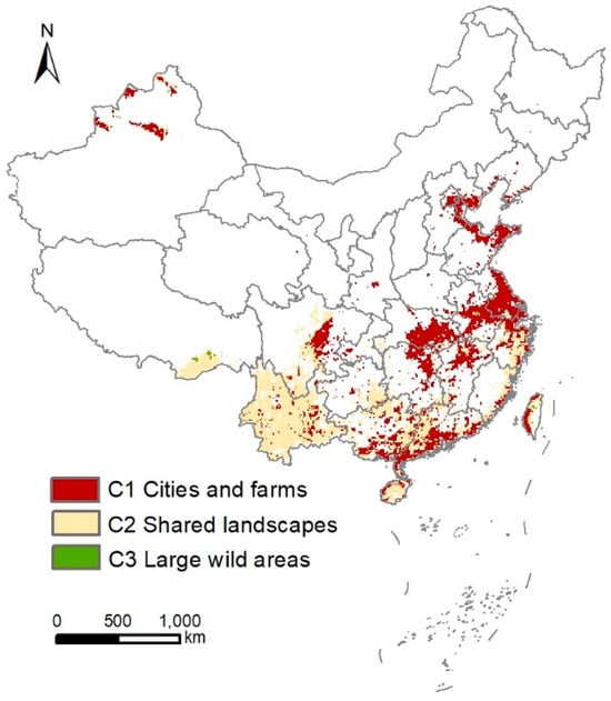 Map of the three conditions of the bird conservation gap area in China: C1 cities and farms (red), C2 shared landscapes (light yellow), and C3 large wild areas (green).
