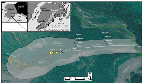 We conducted our investigation in Kenai Fjords National Park (KEFJ), located along the eastern coastline of the Kenai Peninsula in south-central Alaska (Figure 1). Our study area was focused on the Exit Glacier Developed Area (EGDA) as the only region of KEFJ accessible to motor vehicles by means of Exit Glacier Road, a 2.4 km long, two-lane paved route with a 56 km/h (35 mph) speed limit that funnels over 100,000 people into the EGDA every year (Figure 1). Park staff count the number of vehicles entering the EGDA on an annual basis when the park’s gate is open to motor vehicles between May and October (see [24] for details).