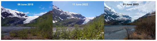 Although the EGDA only features a small number of trails and amenities, it has experienced an average annual increase in visitation of 4.35% since 2010, catering to roughly 153,690 visitors/year on average. Visitors are primarily drawn to the EGDA to see Exit Glacier as one of Alaska’s most accessible and rapidly shrinking glaciers, having retreated approximately 50 m/year since 2010 (Figure 2) [25]. The EGDA lies within the deglaciated moraine of Exit Glacier, possessing a dynamic hydrological landscape with Exit Creek fed by melting glacial ice, snowmelt from the surrounding Kenai Mountains, and rainwater. The forest interior features various small, ephemeral streams as remnants of the historical Exit Creek.