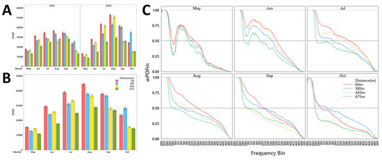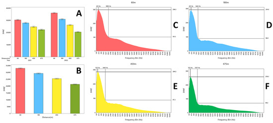 The spectral sonic signature (SSS) at sample distances expressed distinctive differences when compared between years and years combined (Table 1). Sample sites at 60 m exhibited the highest SSS values compared to all other distances when compared between years and years combined (Table 1). The SSS of 60 and 675 m displayed opposing values when compared between years with 60 m having a greater SSS value in 2022 than in 2021, while at 675 m, the SSS value was greater in 2021 than in 2022 (Table 1).