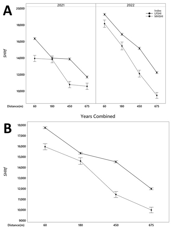 Spatial distribution of average SHItf and 95% CI in the categories of low frequency (<2000 Hz) (LFSHI) and mid-high frequency (>2000 Hz) (MHSHI) at interval distances from Exit Glacier Road within Kenai Fjords National Park, Alaska, compared (A) between years and (B) years combined.